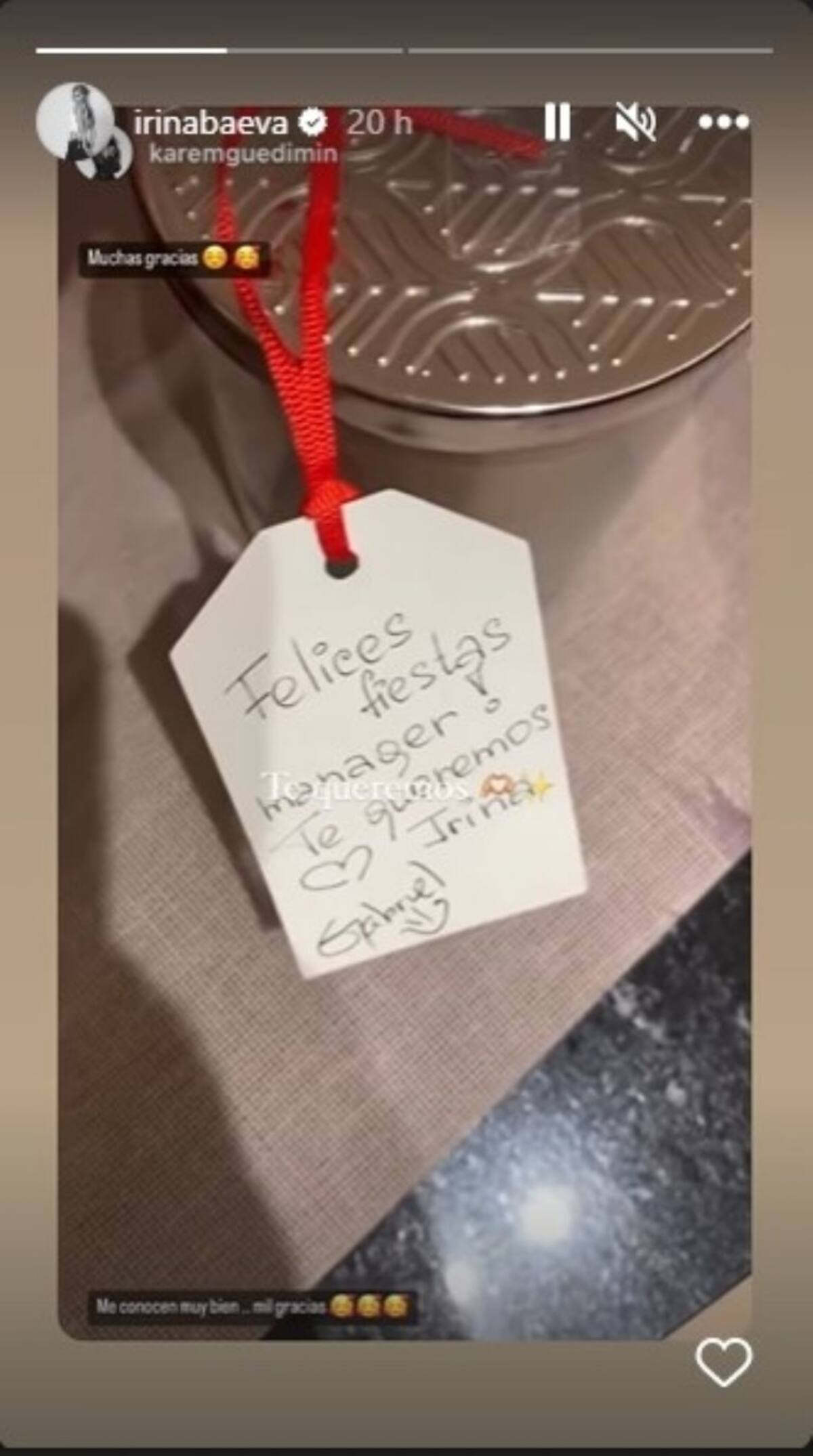 Los actores tuvieron algunos detalles con su gente más cercana y mandaron obsequios para ellos, como por ejemplo a su mánager Karem Guedimin, a quien le regalaron una botella de vino que estaba acompañada por una tarjeta firmada por la pareja: “Felices fiesta manager, te queremos. Gabriel e Irina”.