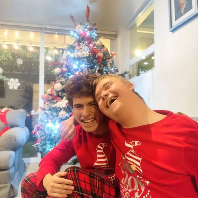 En su posteo, Carlo solo puso un emoji de sonrisa, pero subió varias instantáneas de su famosa mamá, así como de él junto a su árbol de navidad y junto a su hermano Luciano, quien tiene Síndrome de Down, ambos ataviados con pijamas a juego, y otras más en unos edificios y en un lobby.