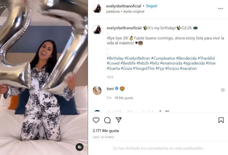 La exMiss Texas publicó un reel en Instagram para celebrar esta fecha con sus seguidores. En el clip aparece con una pijama sobre su cama, mientras sostiene dos globo que formaban en número 26 y que tras soltar el 6 recibe el 7 simbolizando el nuevo ciclo que comenzó. La publicación fue comentada por Toni Costa.