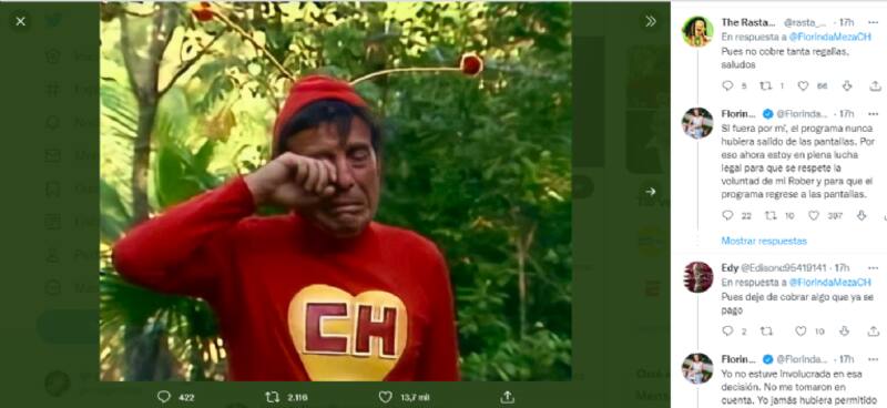 Las reacciones no se hicieron esperar entre algunos de sus seguidores, ya que uno de ellos comentó que no cobrara tantas regalías, a lo que Meza respondió: “Si fuera por mí, el programa nunca hubiera salido de las pantallas. Por eso ahora estoy en plena lucha legal para que se respete la voluntad de mi Rober y para que el programa regrese a las pantallas”.