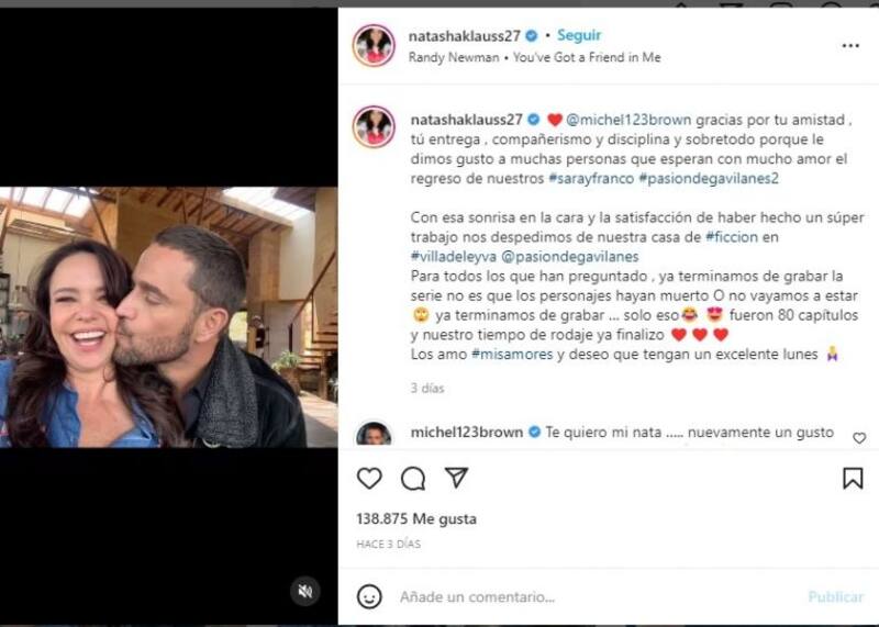 Natasha Klauss, quien es una de las protagonistas de la primera y segunda temporada de “Pasión de Gavilanes” se mostró muy agradecida con el fin de grabaciones y le dedicó un tierno mensaje a su compañero Michel Brown.