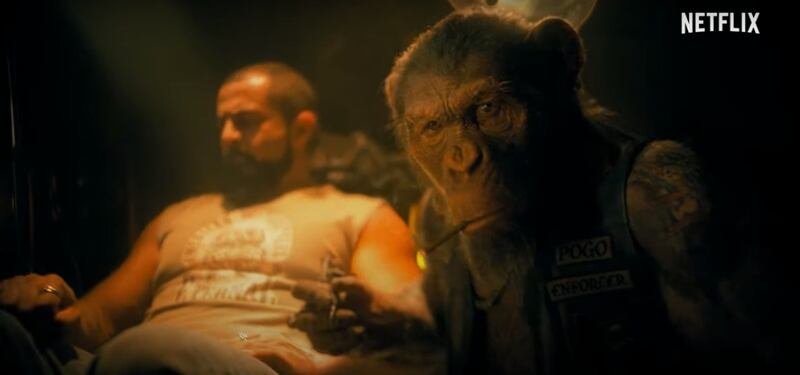 En la última parte del tráiler Cinco llega a un lugar y deja escapar unas palabras: "A ti te estaba buscando", menciona. En siguiente plano la cámara capta a un chimpancé tatuando a una persona, al voltearse este animal se puede leer su nombre en el chaleco de mezclilla que porta: Pogo.