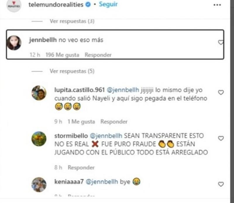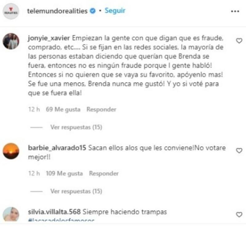 "Fraude total, se tenía que ir nacho”, “Aquí están protegiendo a Nacho qué locura”, “Realmente no creo en este programa”, “Fraude por qué si fuimos muchos lo que botamos por Brenda”, “Si se fijan en las redes sociales, la mayoría de las personas estaban diciendo que querían que Brenda se fuera, entonces no es ningún fraude porque la gente habló!”, dijeron.