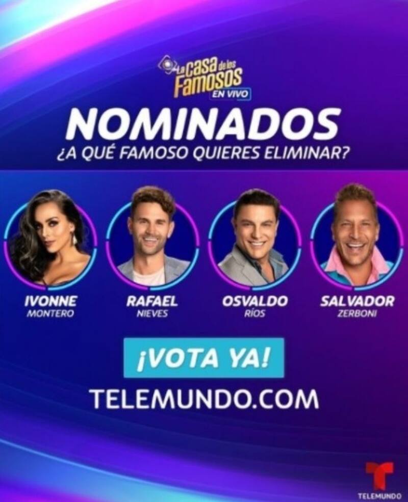 Ivonne Montero, Salvador Zerboni, Osvaldo Ríos y Rafael Nieves resultaron nominados la noche del miércoles, muchos aseguran que Nacho salvará a Osvaldo, pero esto aún es un misterio pues todo puede pasar. Aún con esta posibilidad, en redes sociales ya se han unido para votar por Ríos y así lograr su eliminación.