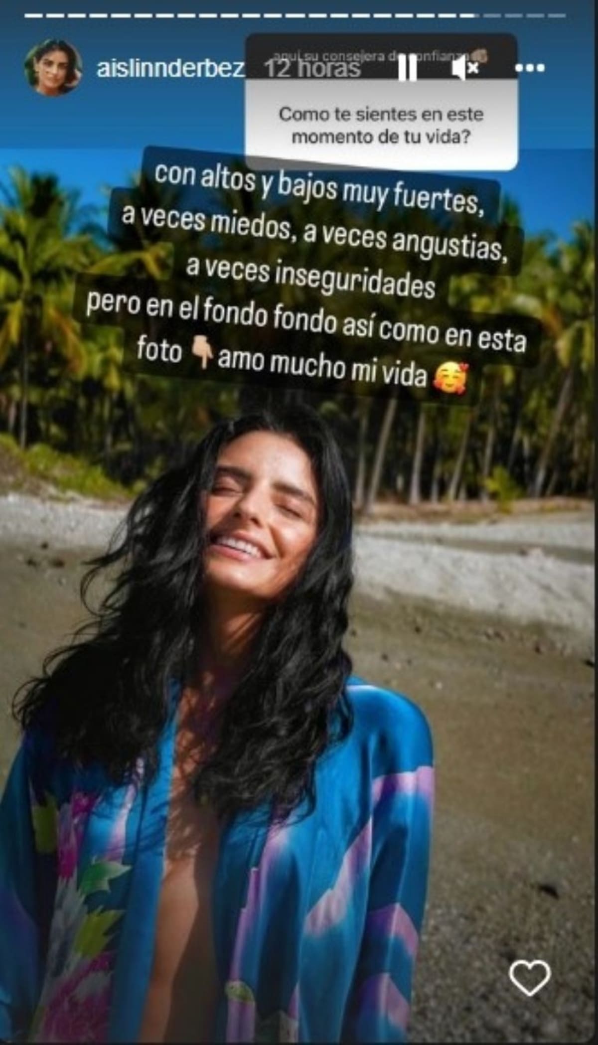 Por último Aislinn también confesó que pese a que en este momento de su vida tiene inseguridades y angustia, está conforme con su vida: “Con altos y bajos muy fuertes, a veces miedos, a veces angustias, a veces inseguridades pero en el fondo fondo así como en esta foto amo mucho mi vida”.