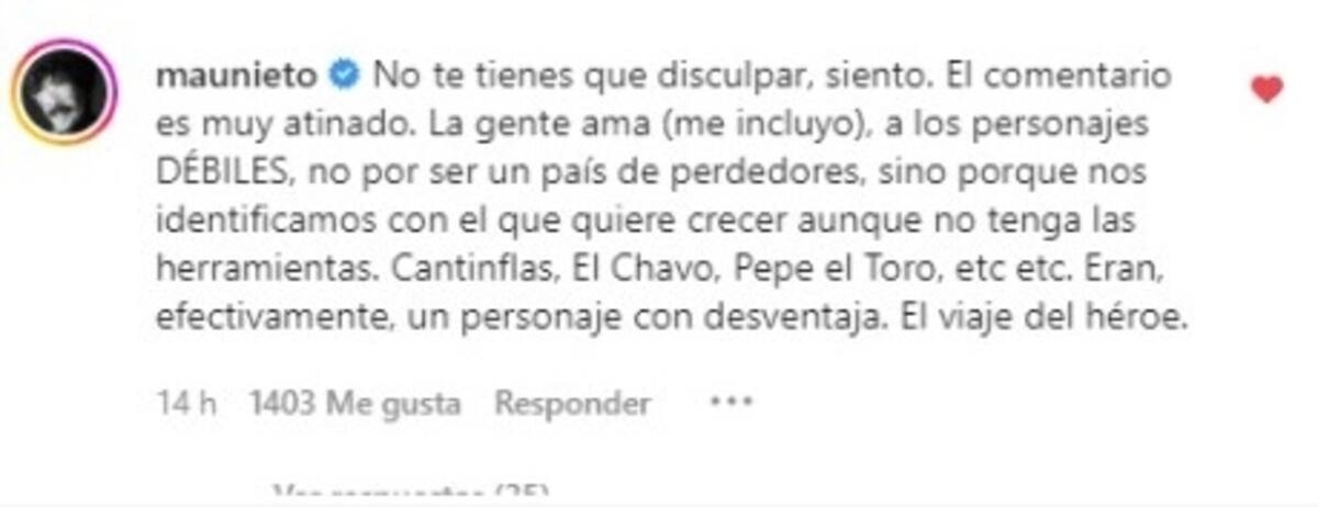 "Lo que siempre he pensado es que solo reconociendo nuestros verdaderos talentos, y un esfuerzo bien dirigido, se puede llegar a una meta. Gracias", finalizó en su escrito. Ante lo dicho el comediante Mau Nieto le mencionó que "no se tenía que disculpar". "El comentario es muy atinado. La gente ama (me incluyo), a los personajes DÉBILES, no por ser un país de perdedores, sino porque nos identificamos con el que quiere crecer aunque no tenga las herramientas. Cantinflas, El Chavo, Pepe el Toro, etc etc. Eran, efectivamente, un personaje con desventaja. El viaje del héroe", escribió recibiendo gran apoyo de los cibernautas quienes concordaron con Nieto y Horacio.