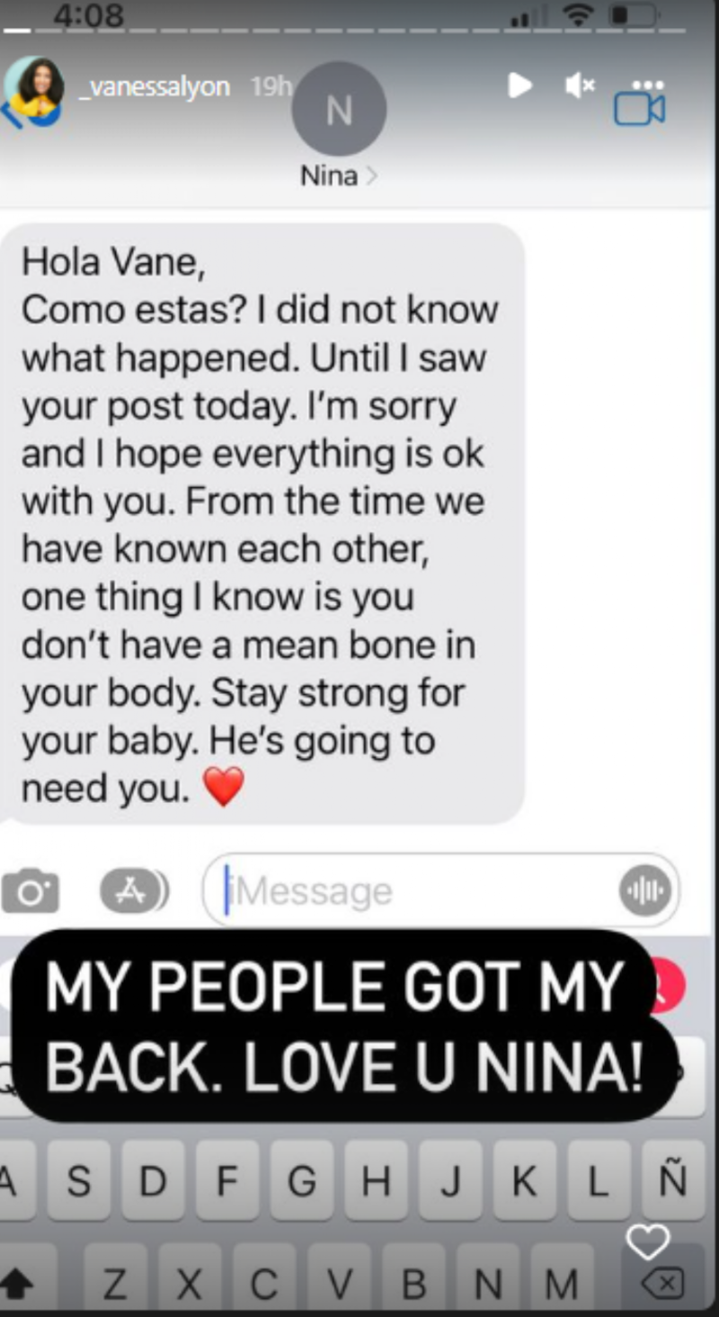 "Desde que nos conocemos hay una cosa que siempre he tenido clara, y es que no hay un hueso en tu cuerpo que tenga maldad alguna. Mantente fuerte por tu hijo. Te va a necesitar", se lee en el texto, donde Vanessa también escribió: “Mi gente me protege”.