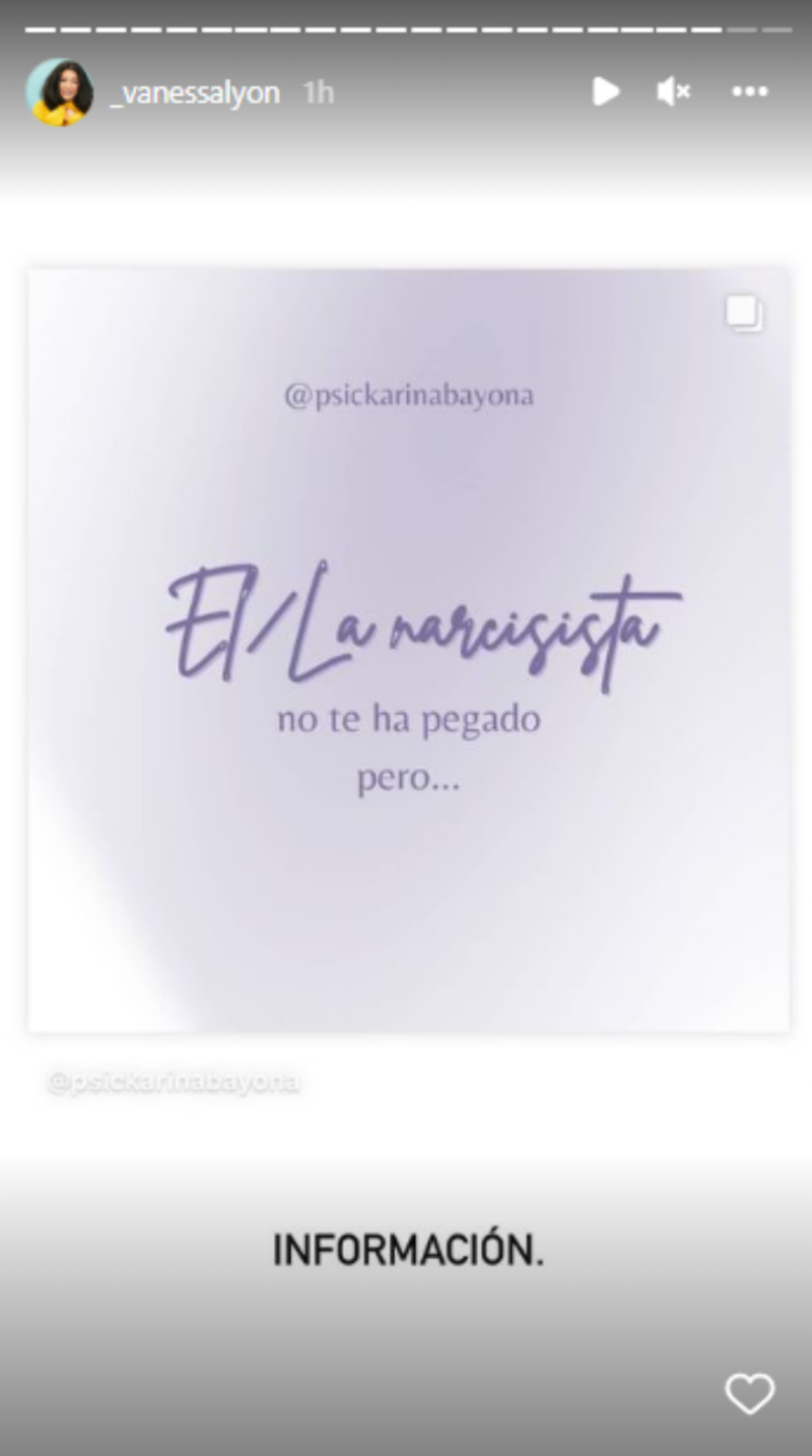 Posteriormente, publicó imágenes en las que describió a gran detalle las características de una persona narcisista y aunque no mencionó a Carlos Calderón, por el contexto en el que esto sucede, hay quienes aseguran que esos mensajes llevarían dedicatoria.