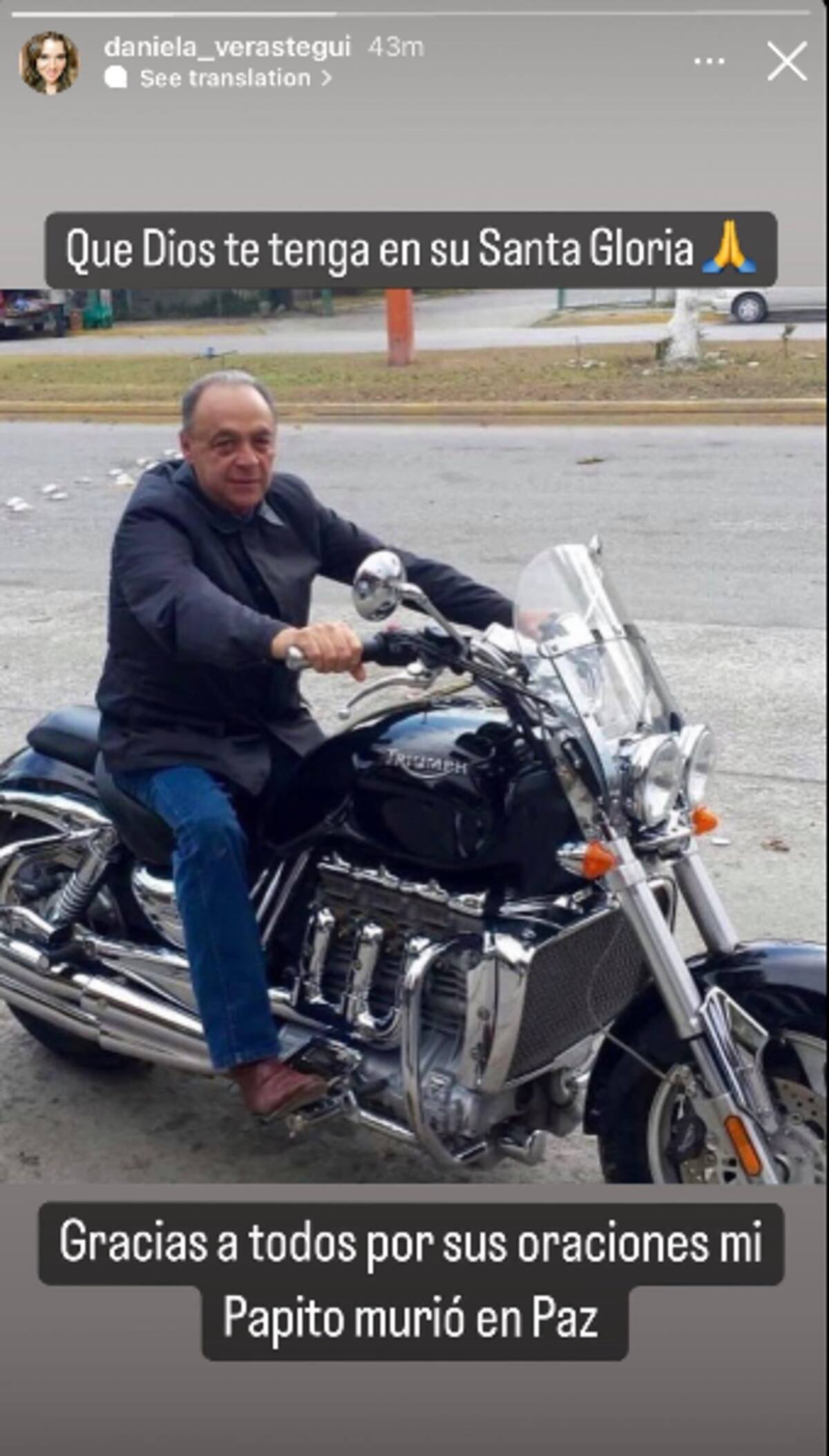 Daniela Verastegui, hermana de Eduardo, también publicó una foto en sus historias de Instagram con un mensaje de agradecimiento: "Qué Dios te tenga en su santa gloria. Gracias a todos por sus oraciones, mi papito murió en paz".