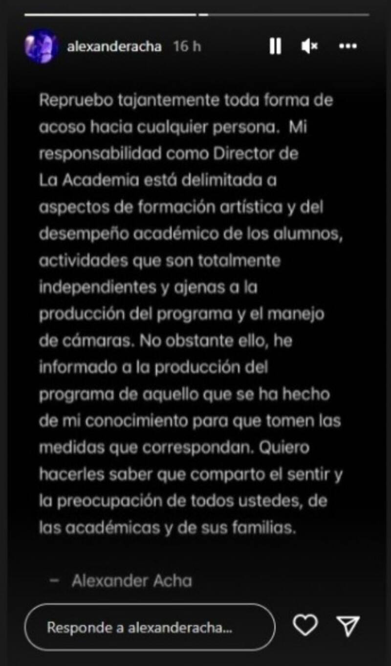 “Mi responsabilidad como director de La Academia está delimitada a aspectos de formación artística y del desempeño académico de los alumnos, actividades que son totalmente independientes y ajenas a la producción del programa y el manejo de cámaras. No obstante ello, he informado a la producción del programa de aquello que se ha hecho de mi conocimiento para que tomen las medidas que correspondan”, mencionó Alexander en su escrito.