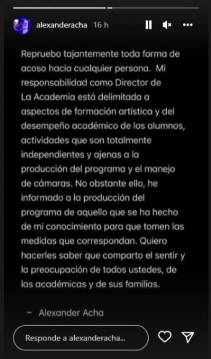 “Mi responsabilidad como director de La Academia está delimitada a aspectos de formación artística y del desempeño académico de los alumnos, actividades que son totalmente independientes y ajenas a la producción del programa y el manejo de cámaras. No obstante ello, he informado a la producción del programa de aquello que se ha hecho de mi conocimiento para que tomen las medidas que correspondan”, mencionó Alexander en su escrito.