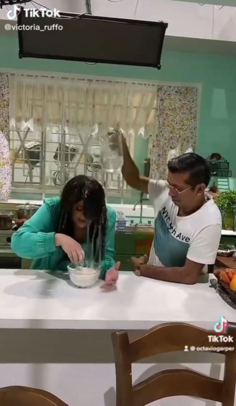 Pero al parecer no le entendió para nada a la actriz, pues en lugar de echarla en el recipiente con harina se la avienta, pero a la cabeza, lo cual provoca que su cuidada cabellera negra, así como parte de su ropa, se empaparan, por lo que la actriz le pega en la cabeza al joven.