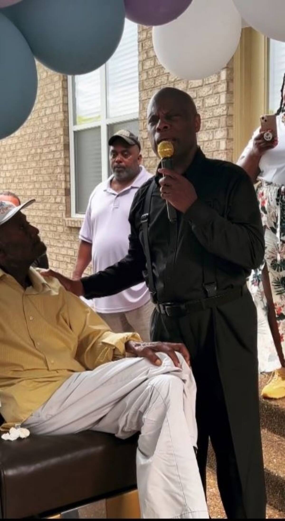 "Mi padre está enfermo y queríamos que todos sus amigos vinieran a celebrarlo mientras él todavía puede recibir la alegría", dijo mientras mostraba la pancarta detrás en la cual venía en enormes letras el nombre de su progenitor: "Él piensa que es algo del 4 de julio", continuó. "Él no sabe… Saldrá y verá todo".