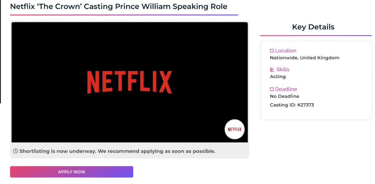 Netflix publicó un anuncio sobre el casting que está realizando para encontrar al actor que dará vida al príncipe William en su etapa de adolescente en la temporada seis de The Crown, la serie que retrata a la familia real. El rodaje de la nueva entrega comenzará en unos pocos días.