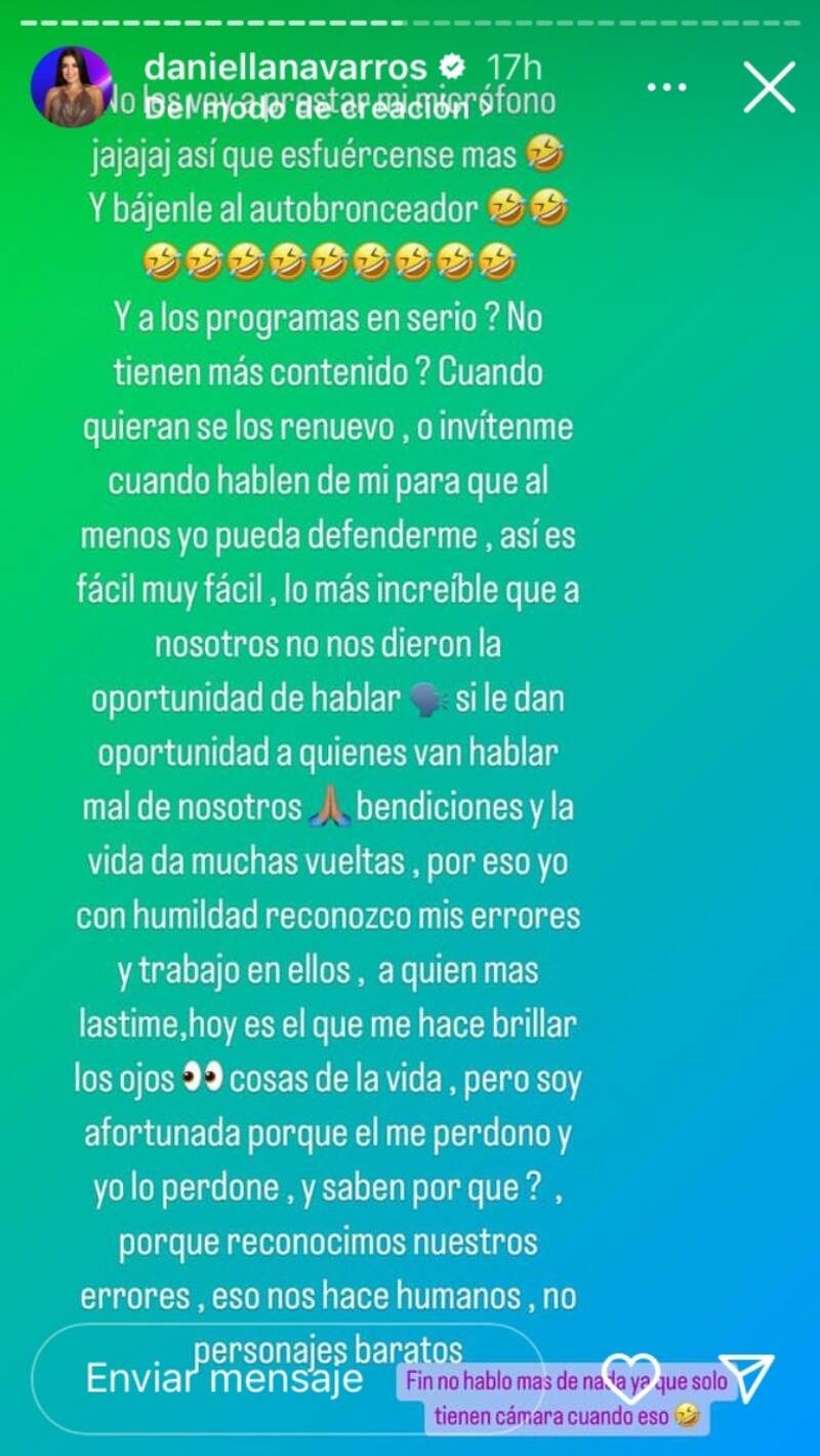Tras la declaraciones de Salvador, Daniella usó su cuenta de Instagram para hablar sobre lo que su ex compañero de reality había mencionado acerca de su relación, y le preguntó al programa de televisión que “si no tenían más contenido” y de no ser así “que por lo menos la invitaran para defenderse”. “Duermo en paz, aceptando todos mis errores y trabajando en mejorar; en cambio algunos siguen siendo un personaje barato y ahora resulta. Pero si todo está grabado. Yo soy el diablo y ellos Juan Pablo segundo. No me interesa nada de esa gente, yo falso y más anaranjado”, expresó Navarro recalcando que le parece “increíble que no le dieron la oportunidad de hablar y a quienes hablan mal de ellos (ella y Nacho) sí”.