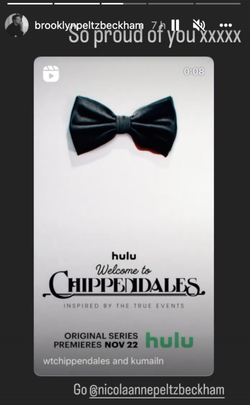 El aspirante a chef publicó un clip, de apenas unos segundos, anunciando la nueva serie de Hulu, Welcome to Chippendales, en la cual participa Nicola. Aunque la actriz no figura entre los primeros créditos de la nueva emisión del servicio de streaming, Brooklyn festejó el logro de la también modelo. “Muy orgulloso de ti”, fue el texto con el que acompañó el cartel que anuncia el estreno del drama.