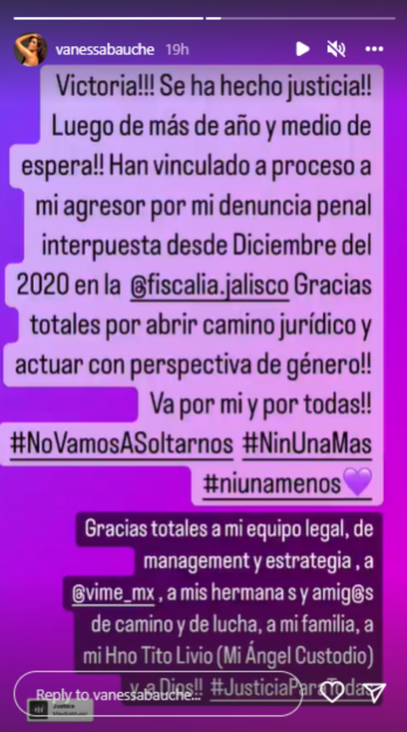 En sus historias de Instagram Vanessa escribió: "¡Victoria, se ha hecho justicia luego de un año y medio de espera!. Han vinculado a proceso a mi agresor por mi denuncia penal interpuesta desde diciembre de 2020. Gracias totales por abrir camino jurídico y actuar con perspectiva de género. Va por mí y por todas”, expresó Bauche.