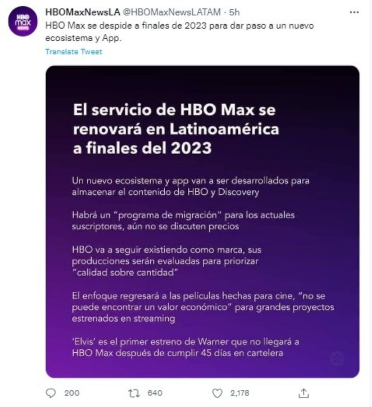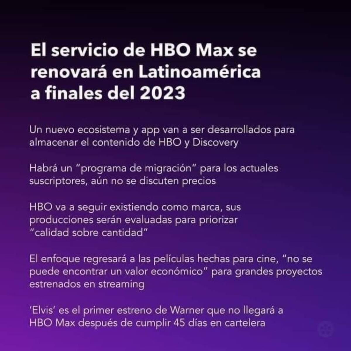 "HBO va a seguir existiendo como marca, sus producciones serán evaluadas para priorizar calidad sobre cantidad’. El enfoque represará a las películas hechas para cine, ‘no se puede encontrar un valor económico’ para grandes proyectos estrenados en streaming. ‘Elvis’ es el primer estreno de Warner que no llegará a HBO Max después de cumplir 45 días en cartelera”, detalla el texto.