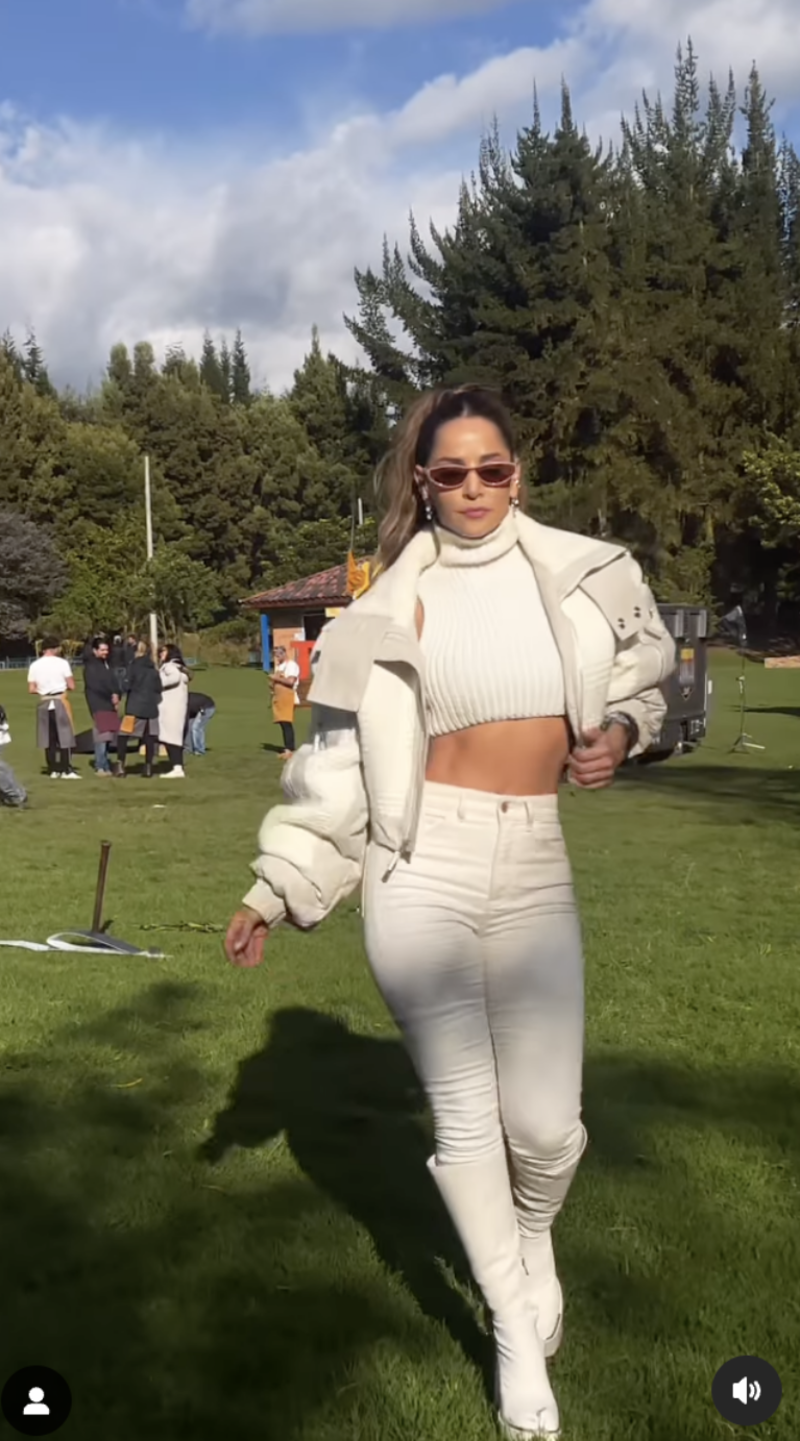 En el clip se puede ver a la presentadora de Top Chef VIP vestida completamente de blanco con jeans, un top corto que deja al descubierto su trabajado abdomen, botas largas y lentes oscuros y haciendo movimientos sensuales frente a la cámara mientras de fondo se escucha la famosa canción de la cantante española.
