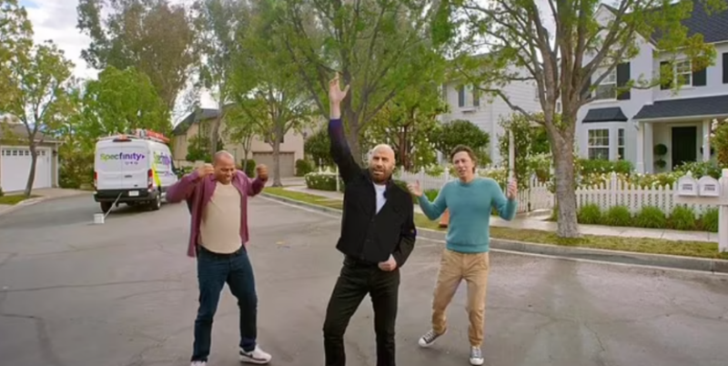 En el comercial Travolta, junto a Zach Braff y Donald Faison, interpreta la famosa canción "Summer Nights" en forma de parodia para publicitar la red 5G que ofrece la empresa.