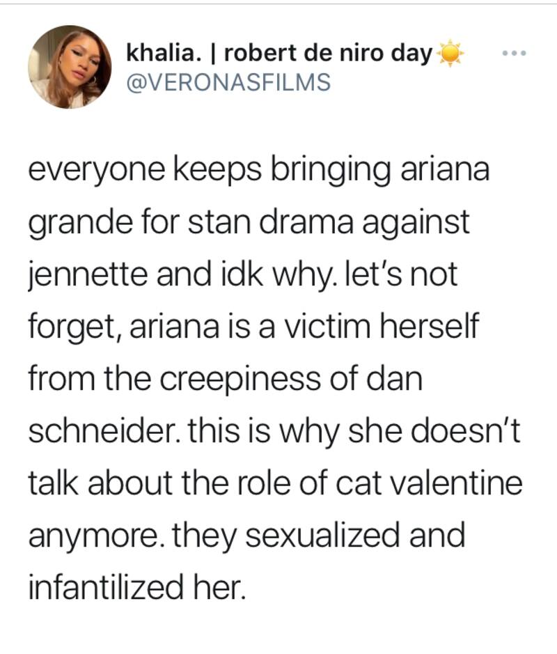 "Todos siguen incluyendo a Ariana Grande en el drama de Jennette y no sé por qué. No olvidemos que Ariana también es una víctima del espeluznante Dan Schneider. Es la razón por la cual ella ya no habla de su papel de Cat Valentine, porque la sexualizaron y la infantilizaron", escribió una usuaria en un posteo en la que subió la grabación de la que todos están hablando.