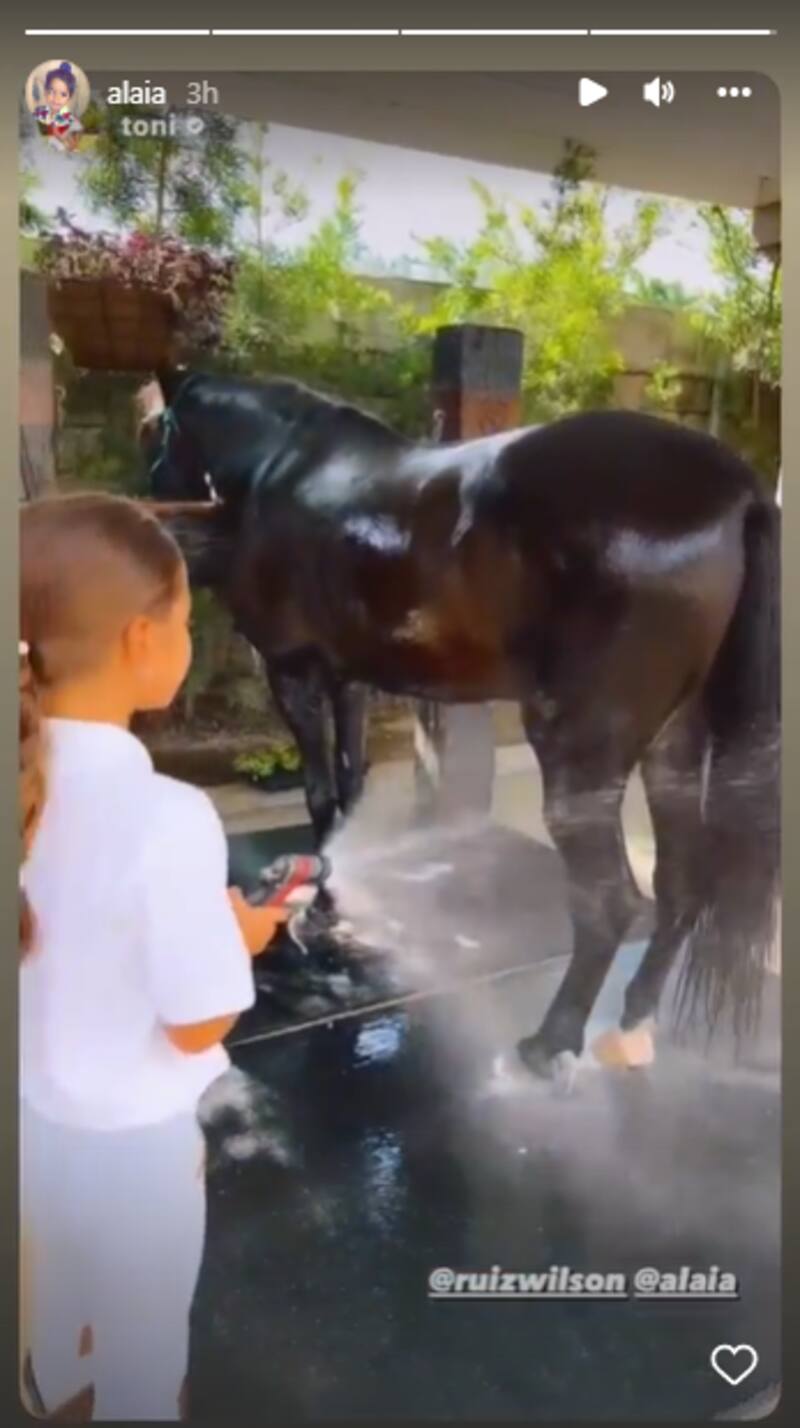 Fue a través de sus historias de Instagram, red administrada por sus padres, donde se pudo apreciar a la pequeña de 7 años mientras sostenía una manguera con la cual lavaba con delicadeza cada parte del caballo, desde las piernas hasta el copete.